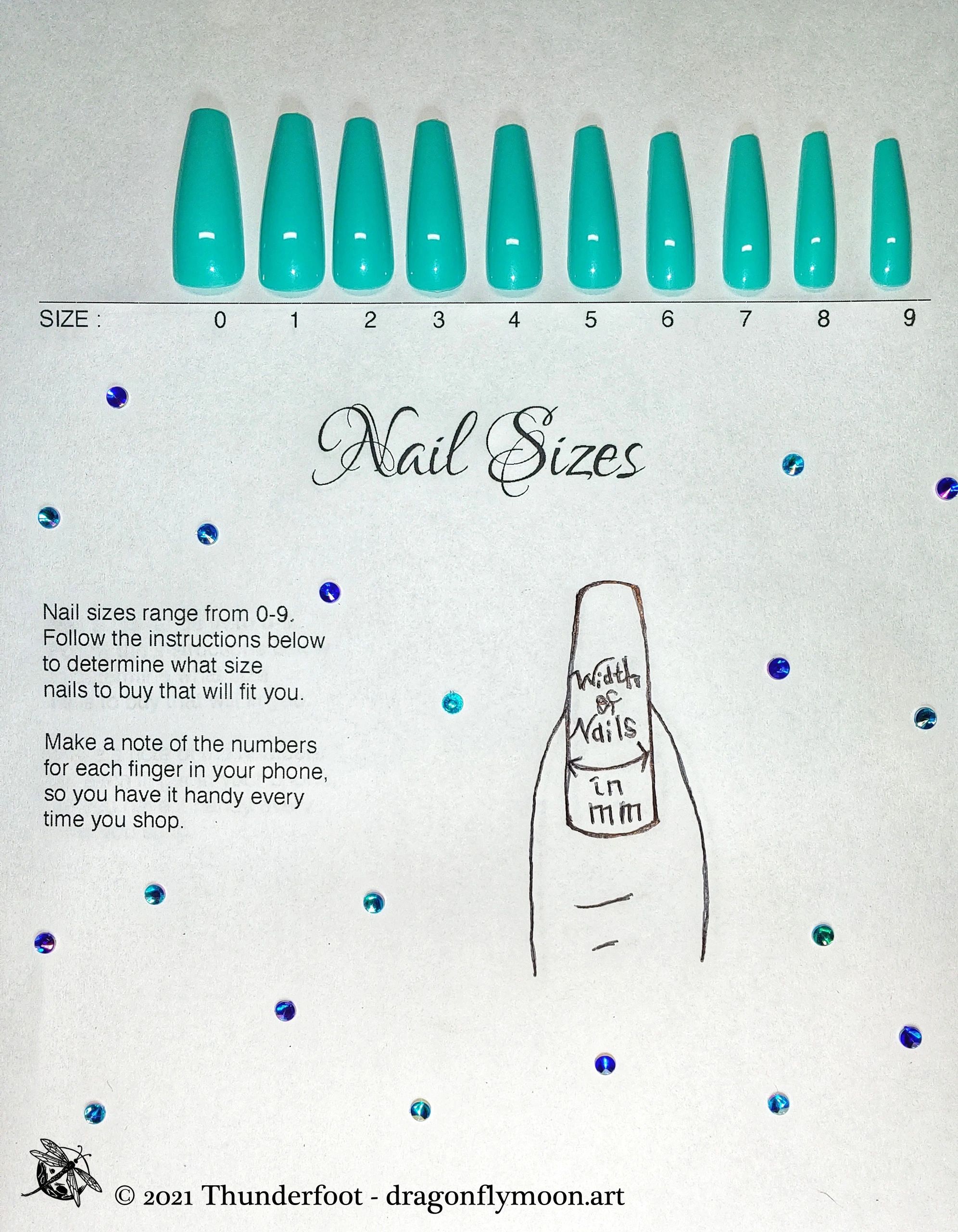 Place the soft tape measure across the widest part of each finger on your natural nail. Then read the millimeters from one side to the other. Look at the chart above to find the corresponding number (0-9; now carrying sizes 10 and 11 not pictured above). Write down the number for each finger on both hands. It is important to do both hands because sometimes we can have a. Finger that is different from one hand to the other. Also, you might not have a standard size fingernail and will need a custom set made.